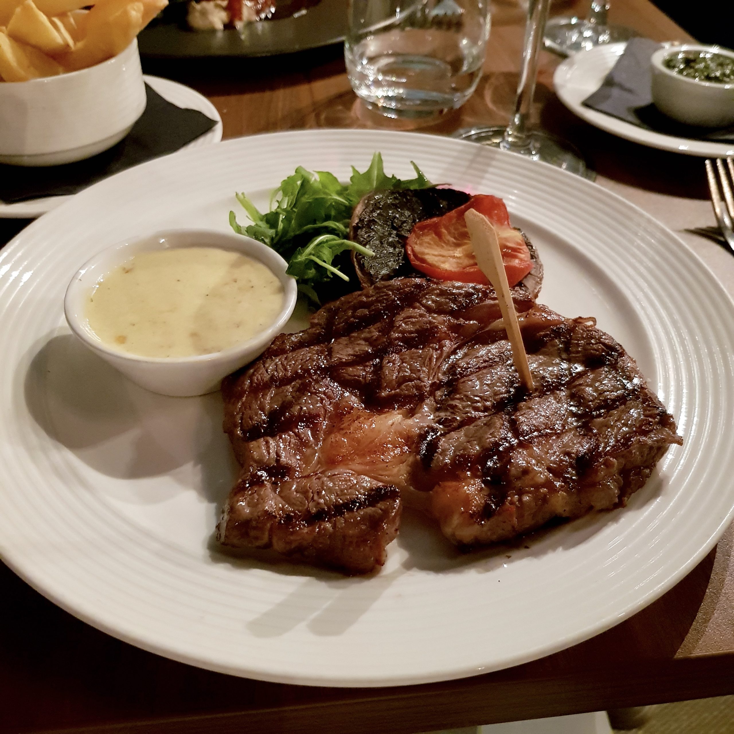 A beautifully cooked 28-day, dry aged Hereford beef. Bursting with flavours. Served with grilled mushroom and tomato, wild rocket, double cooked chips and rich Stilton cream sauce. £22.95