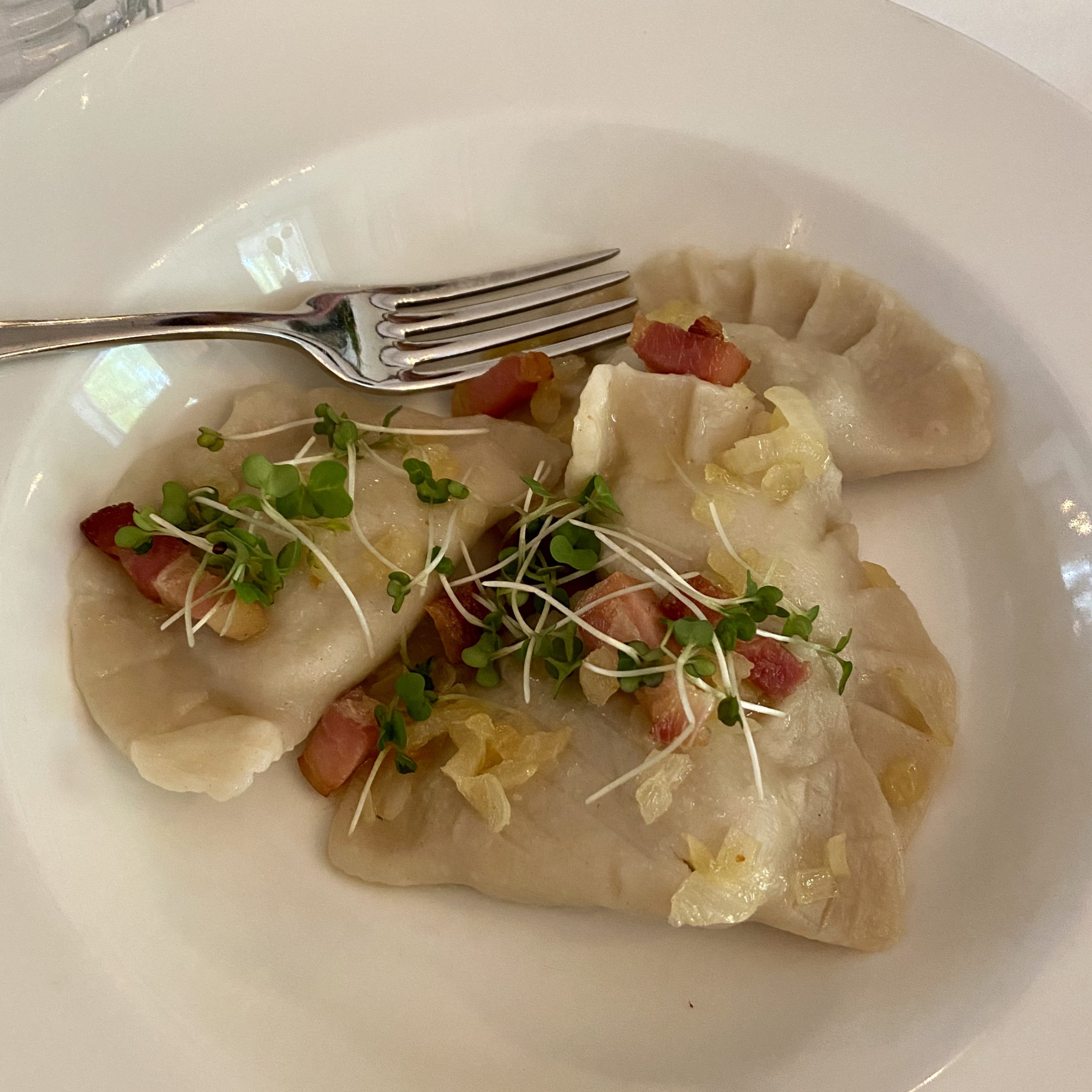 Most popular traditional Polish comfort dish. Steamed dumpling parcels filled with pork and shredded duck. £8