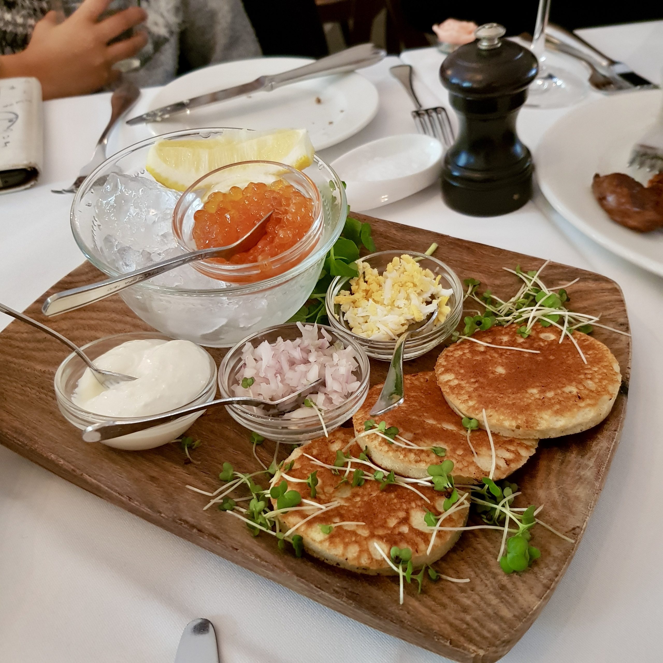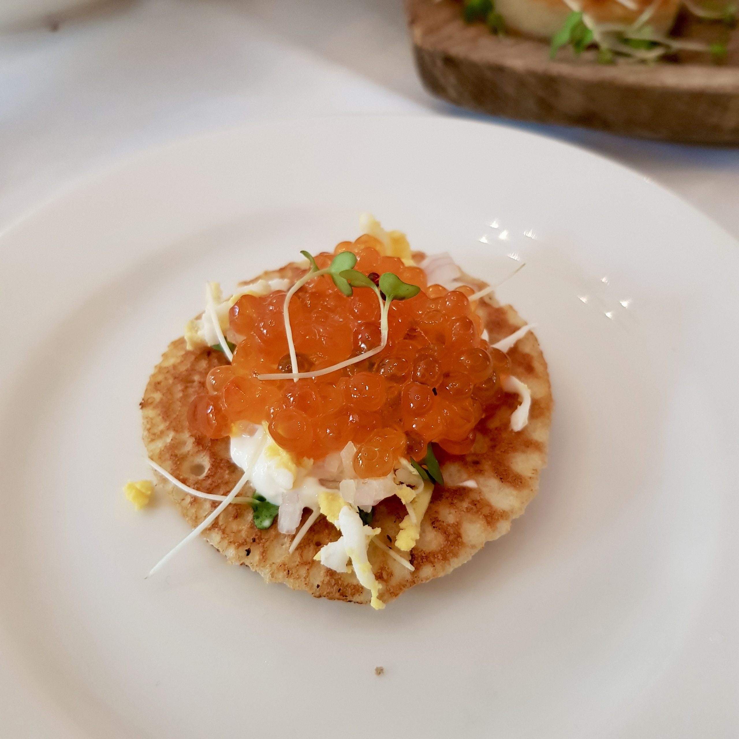 Such a beautifully presented dish. Perfectly browned buckwheat pancakes arranged neatly. with garnishing of sour cream, raw onions and shredded boiled egg. Love the bright orange colour the Keta caviar. £11