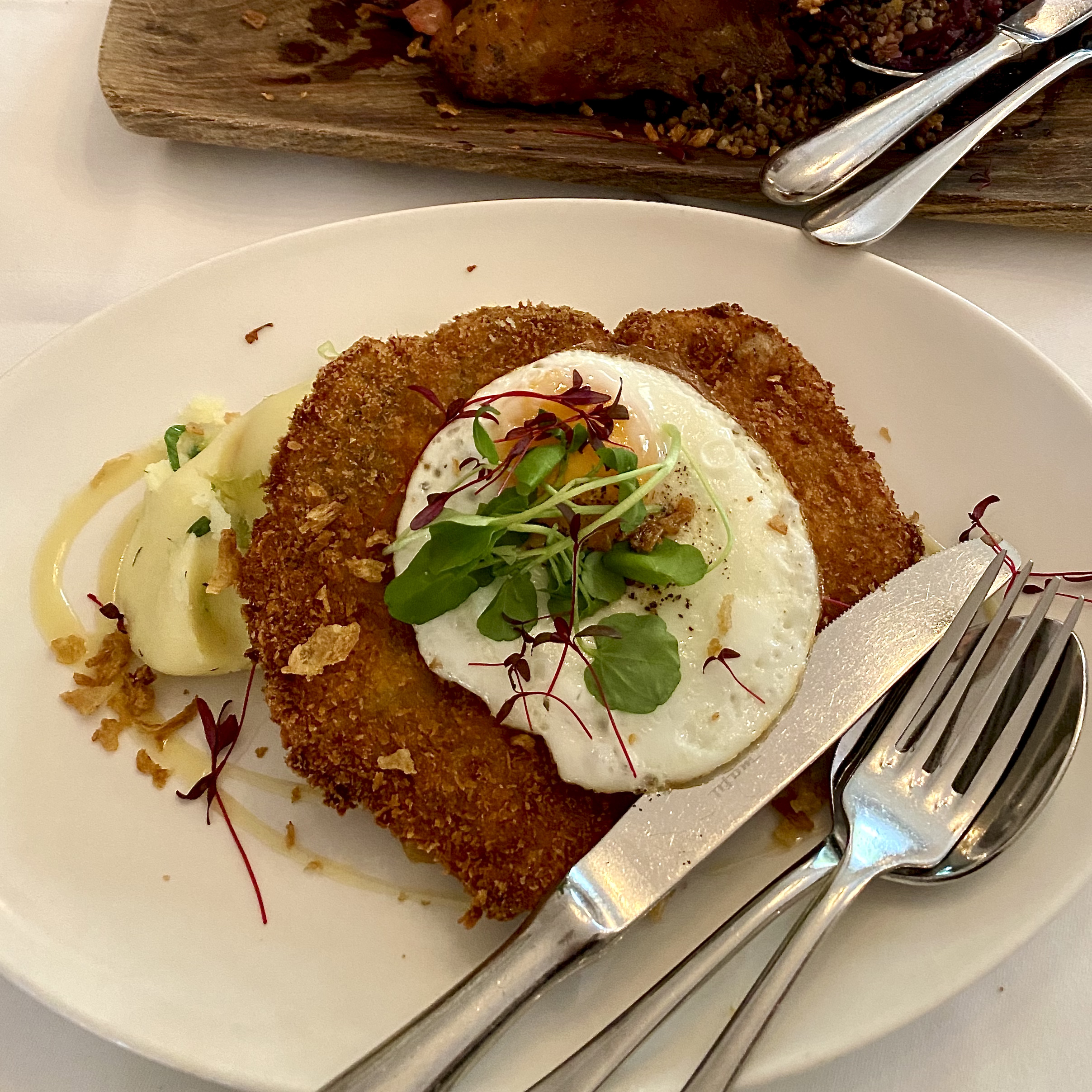One from the neighbour. Beautifully made schitnzel, pounded and tenderised, uniformly coated with crunchy breadcrumbs. Served with smooth mashed potatoes and topped with sunny side up fried egg. £18