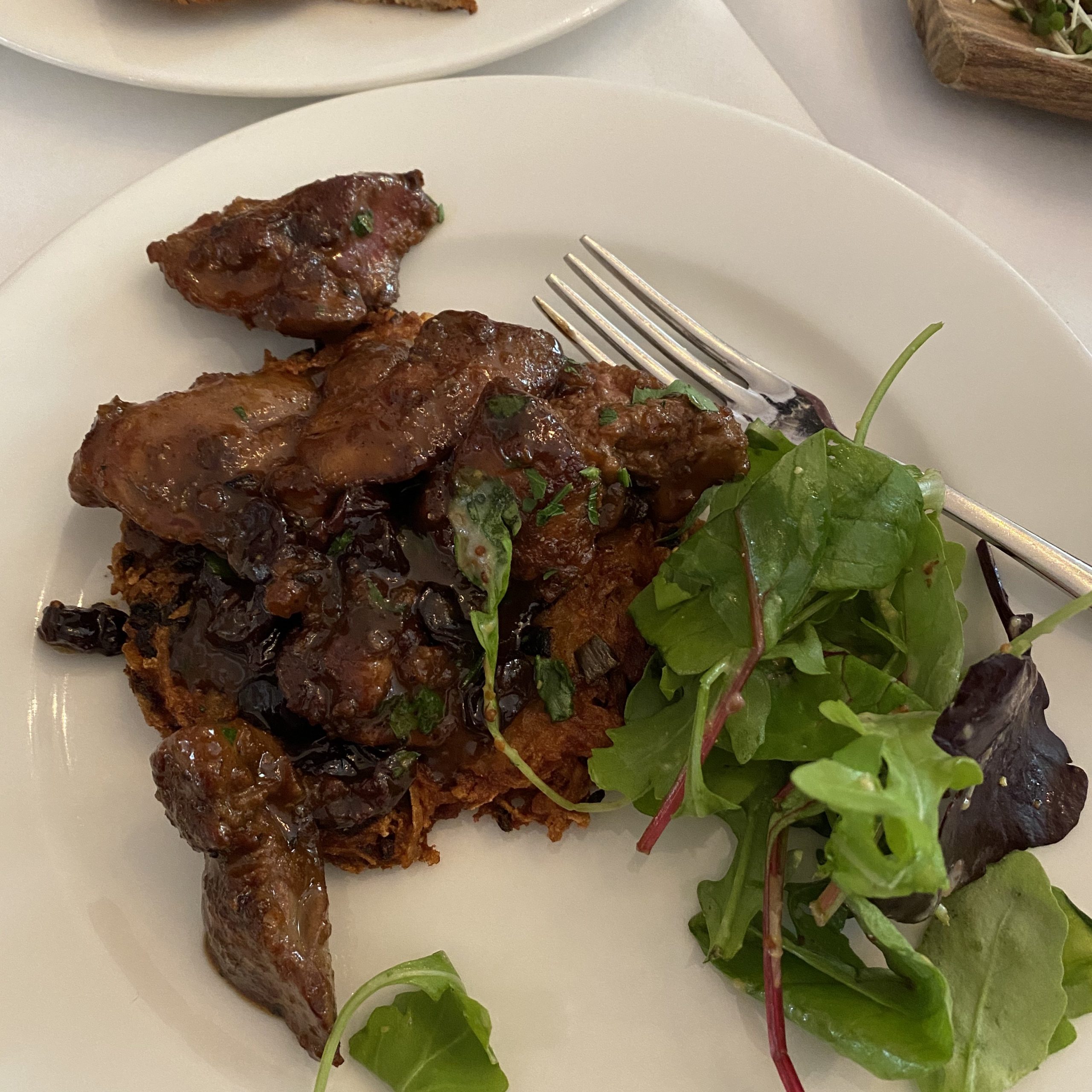 This isn’t a photogenic dish, but it makes it up in taste. Flavoursome spiced chicken livers cooked with dried cherries matched beautifully with the crunchy potato pancakes. £7.50