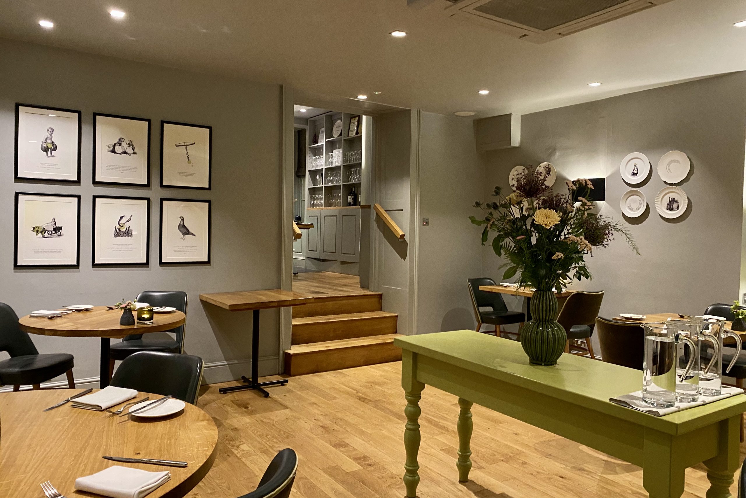 Relaxed and classy. The Olive Tree restaurant is located in the lower ground floor of The Queensbury Hotel in Bath – a boutique hotel converted from four original Georgian townhouses. The restaurant is clean-lined with calming grey walls decorated with quirky black and white drawings in sleek black frames. The space is brightly lit and fitted with plain wooden table and conservative black leather chairs on oak floors.