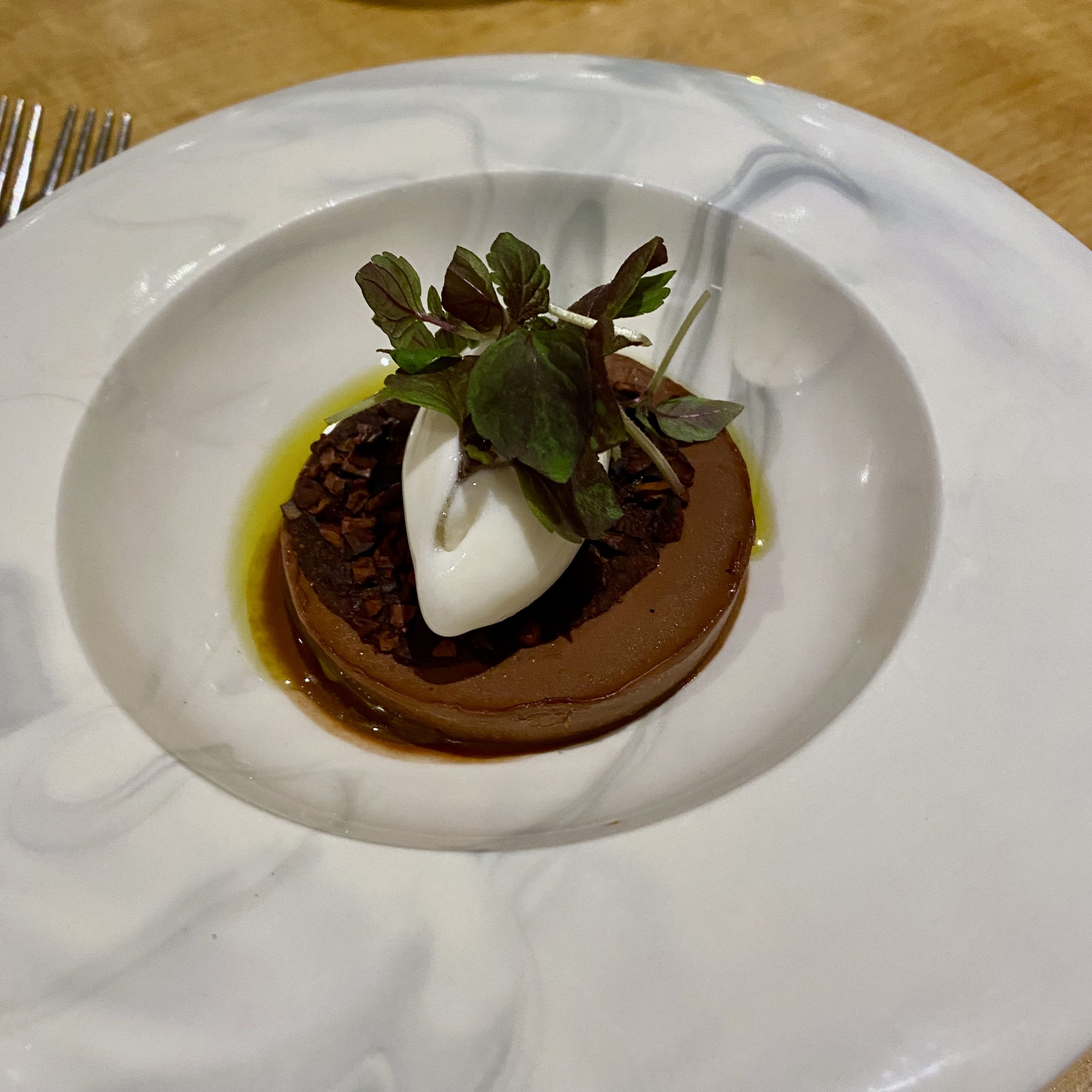 This was the best vegan dessert. Milk-based yoghurt was replaced with an almond-based which went beautifully with the rich Islands Chocolate and delicate flavours from the Manni olive oil.