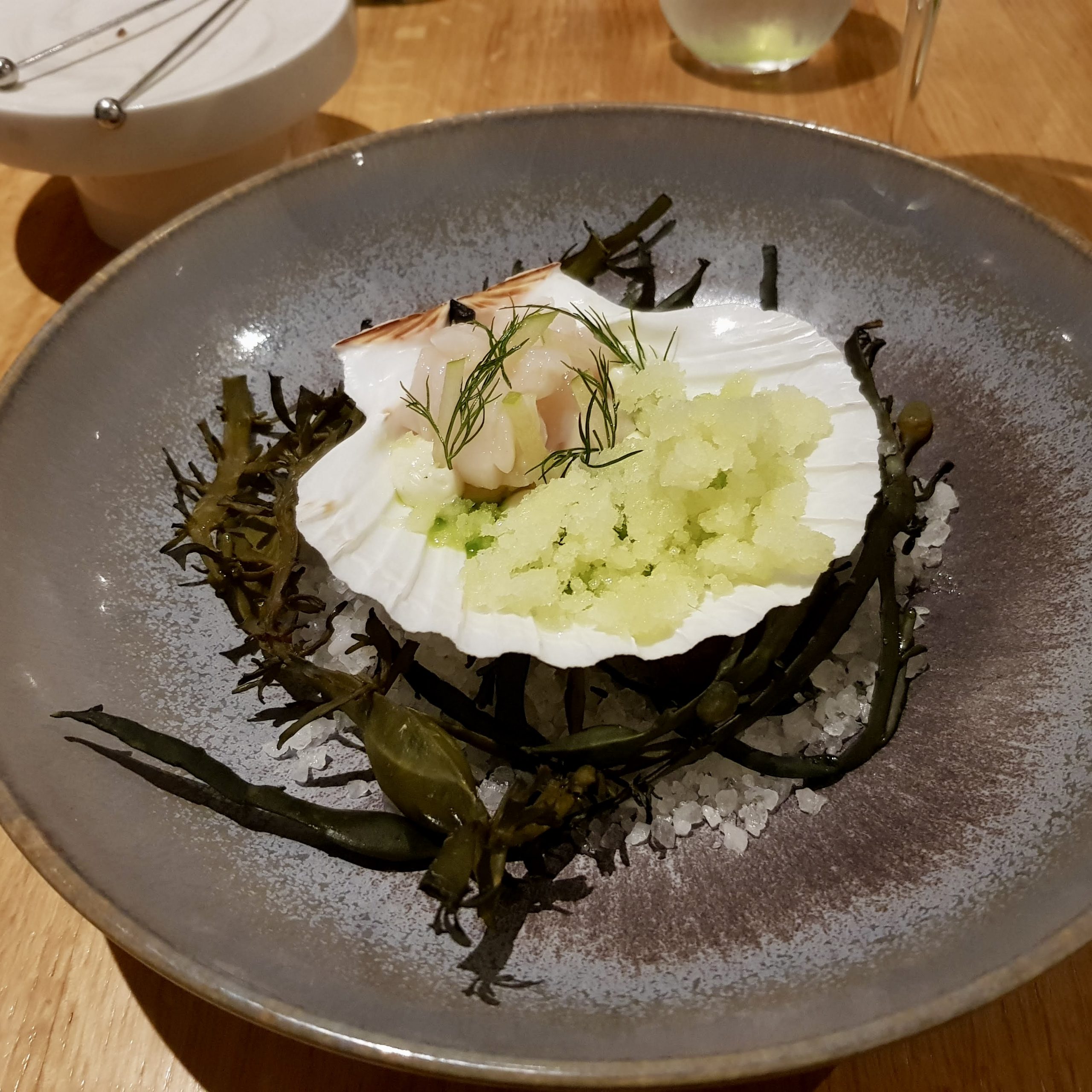 1. Raw Orkney scallop with wasabi, Granny Smith apple and dill