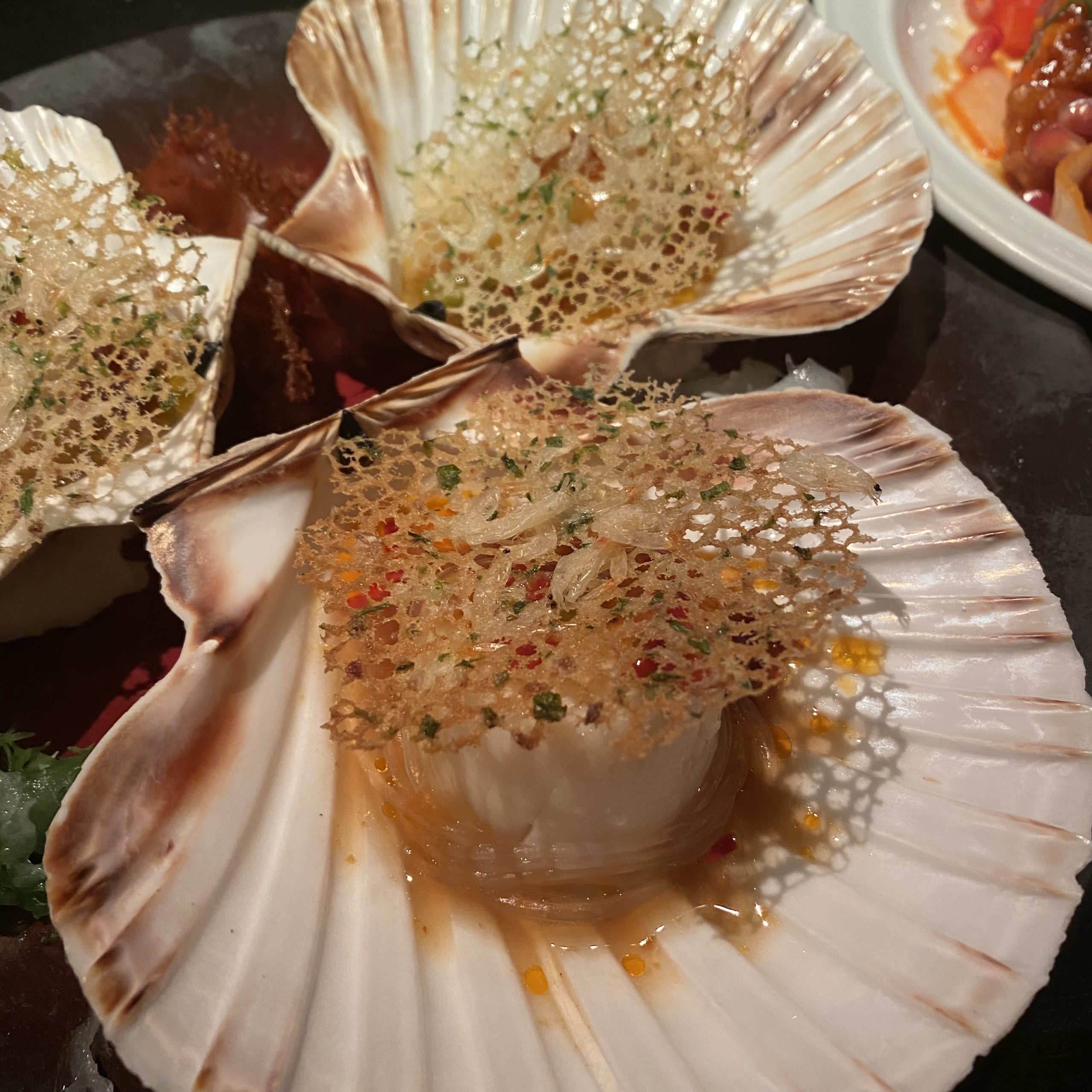 Beautifully presented on shell with a circular lattice peppered with tiny dried shrimps and spring onions. The sweetness of the scallops escaped the dish as they were overdone. Though the shrimps added a hint of salty unami sensation, the dish generally lacked depth in traditional flavours from garlic, chilli and sesame oil. £54
