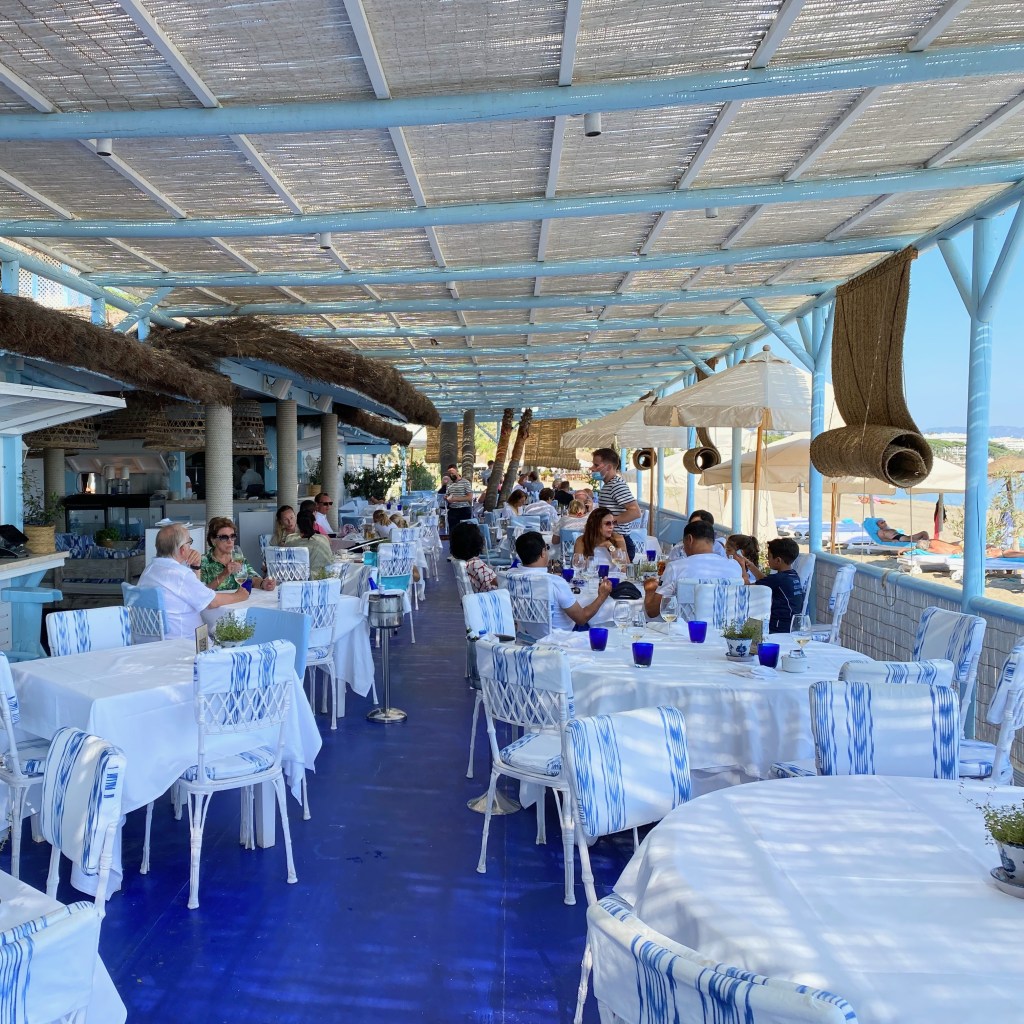 Walk towards the beach from the resort and turn left when you get to the promenade. About 50 meters later, you will be at MC Beach. This is Marbella Club’s chiringuito, or grilled seafood shack on the beach. Classy and gorgeous with the classic white and blue decor. Choose from the regular dining tables, or enjoy fresh grilled octopus and squid with a piña colada on one of the Balinese beds or deck chairs. Afternoon service only.