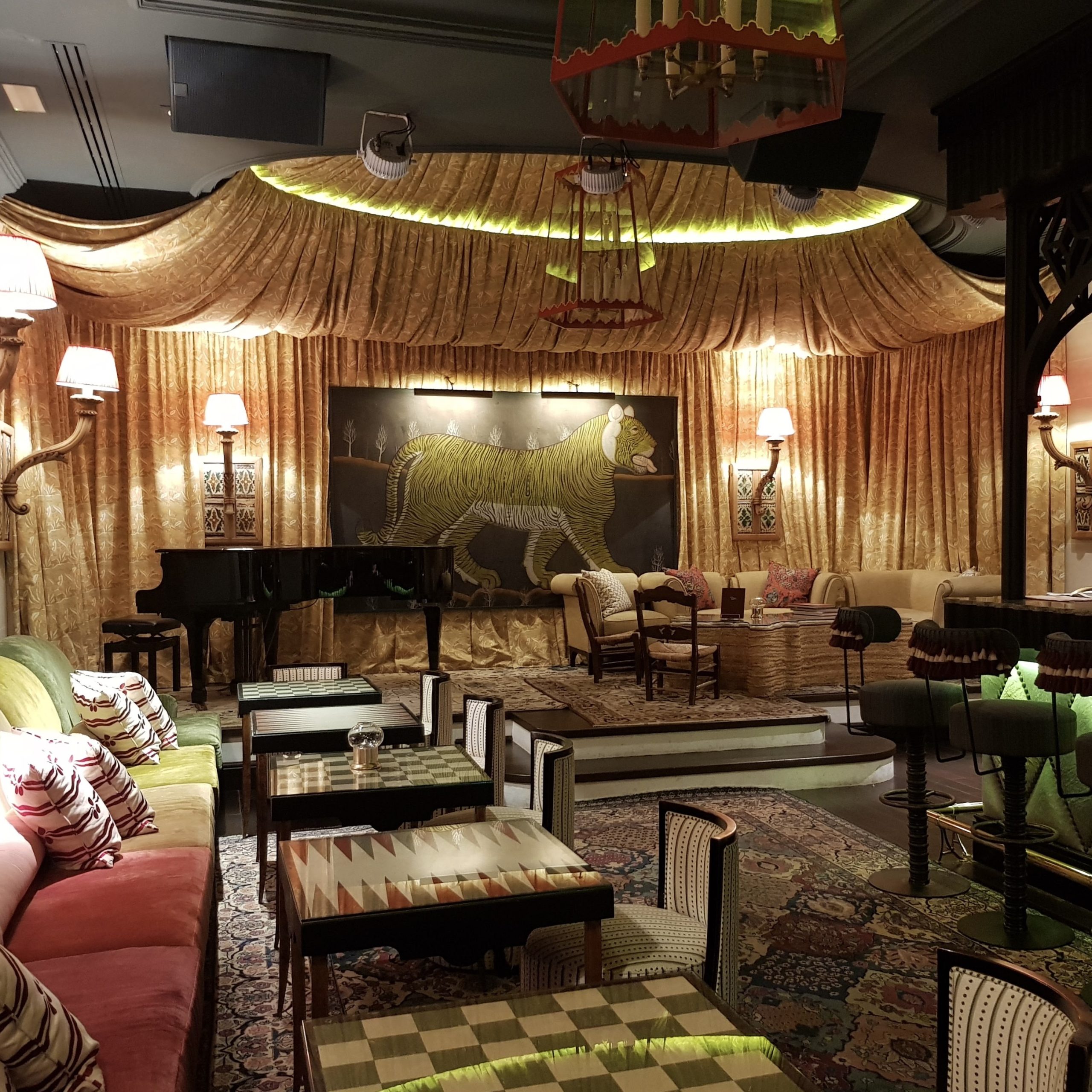 The deliberately ostentatious space evokes tales from the Arabian Nights, with draping gold curtains, bold print carpet and large painting of a walking tiger. It is one of a kind and another experience to cherish from the holiday. Evening service only.