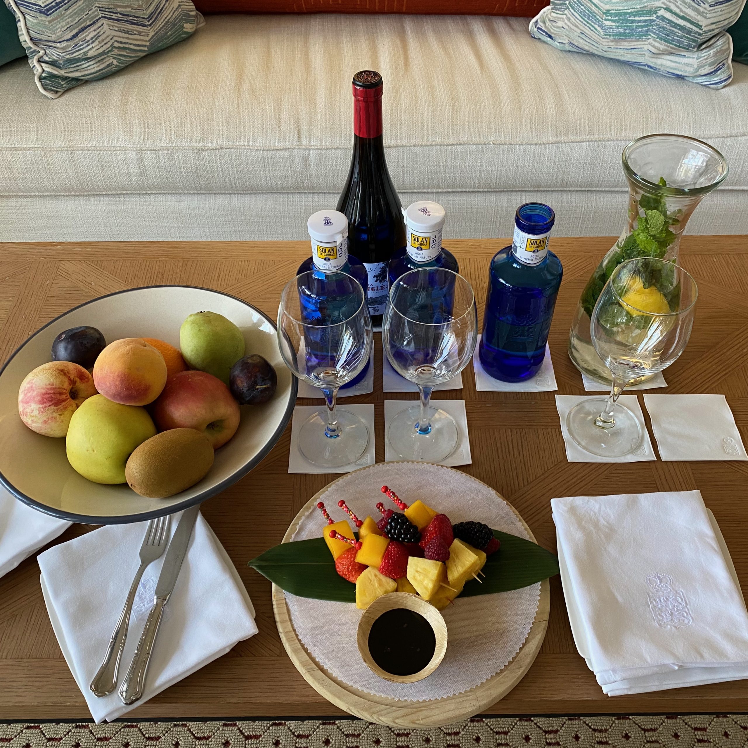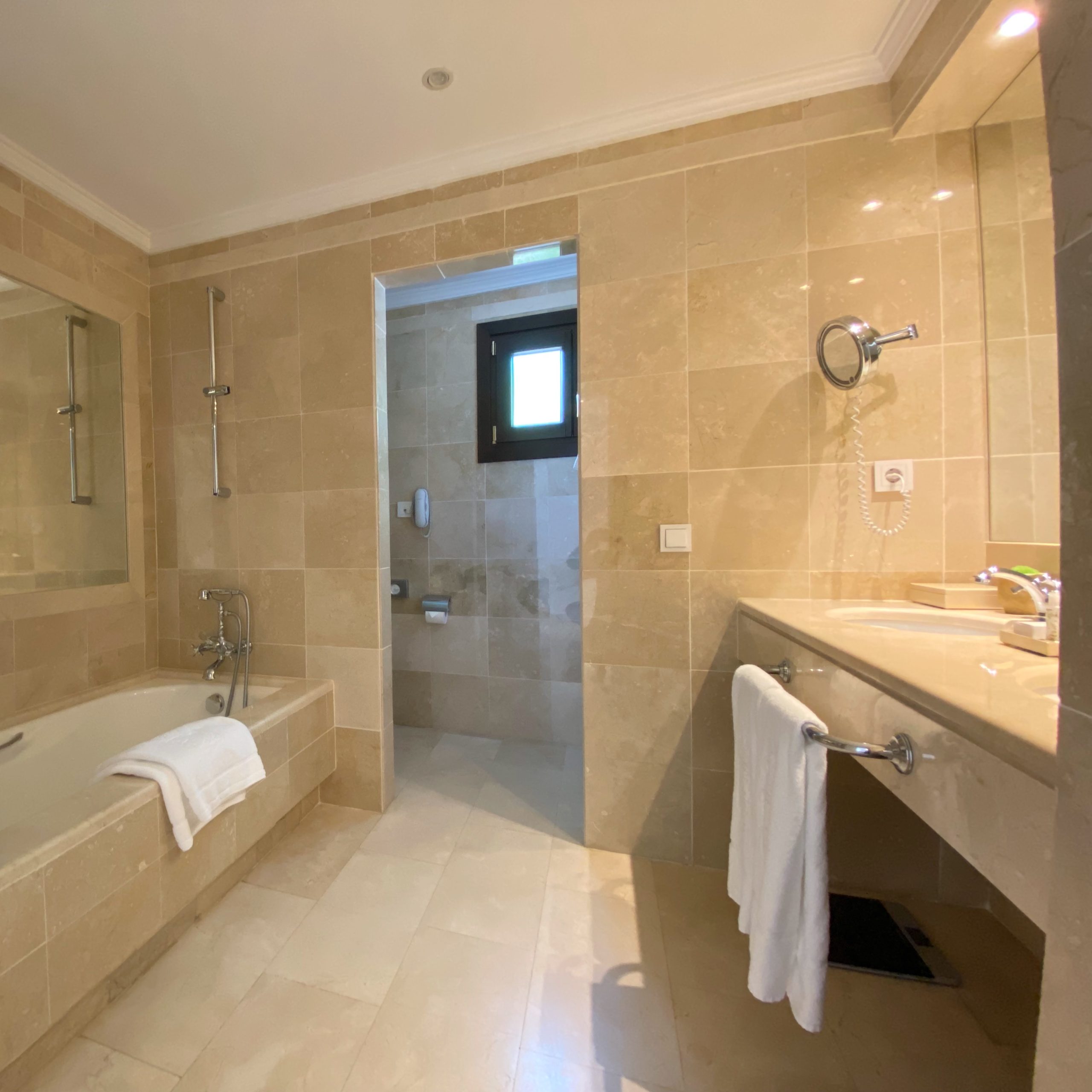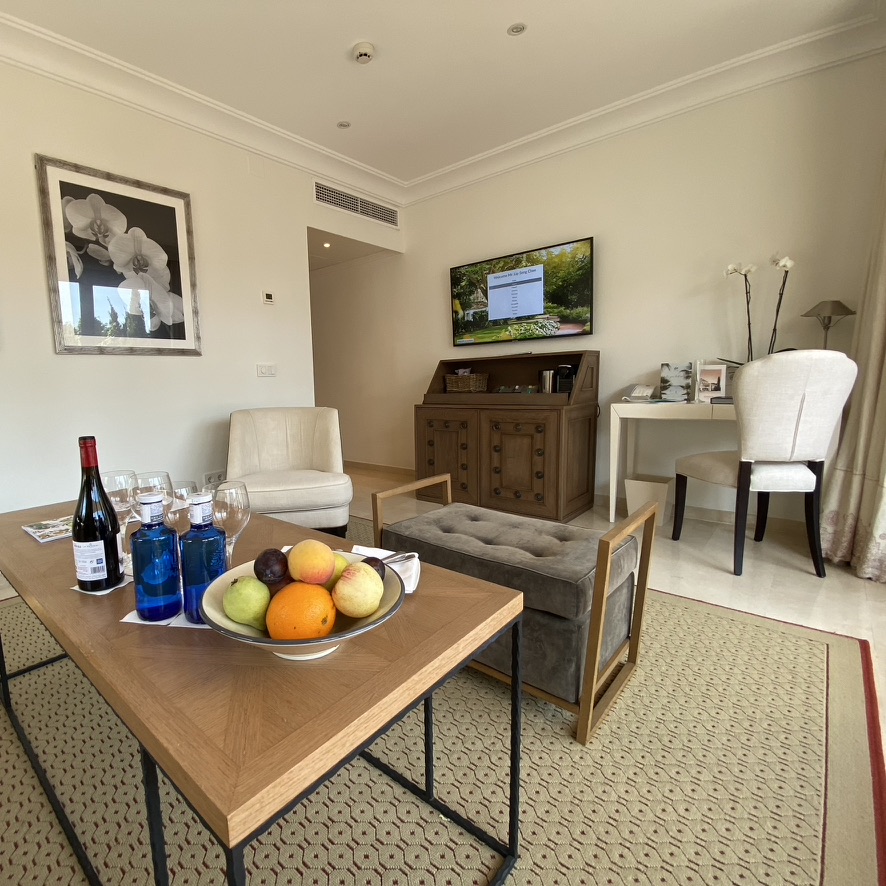 The spacious bedroom faces onto a manicured garden with olive, lemon and orange trees and a pond. Although lovely, it deprives it of privacy. The living room with balcony is bright but isn’t as roomy as the rest of the suite. The view from the balcony isn’t the best as it looks out to the cottage housing room no. 358 and 357 – although their windows are frosted for privacy.