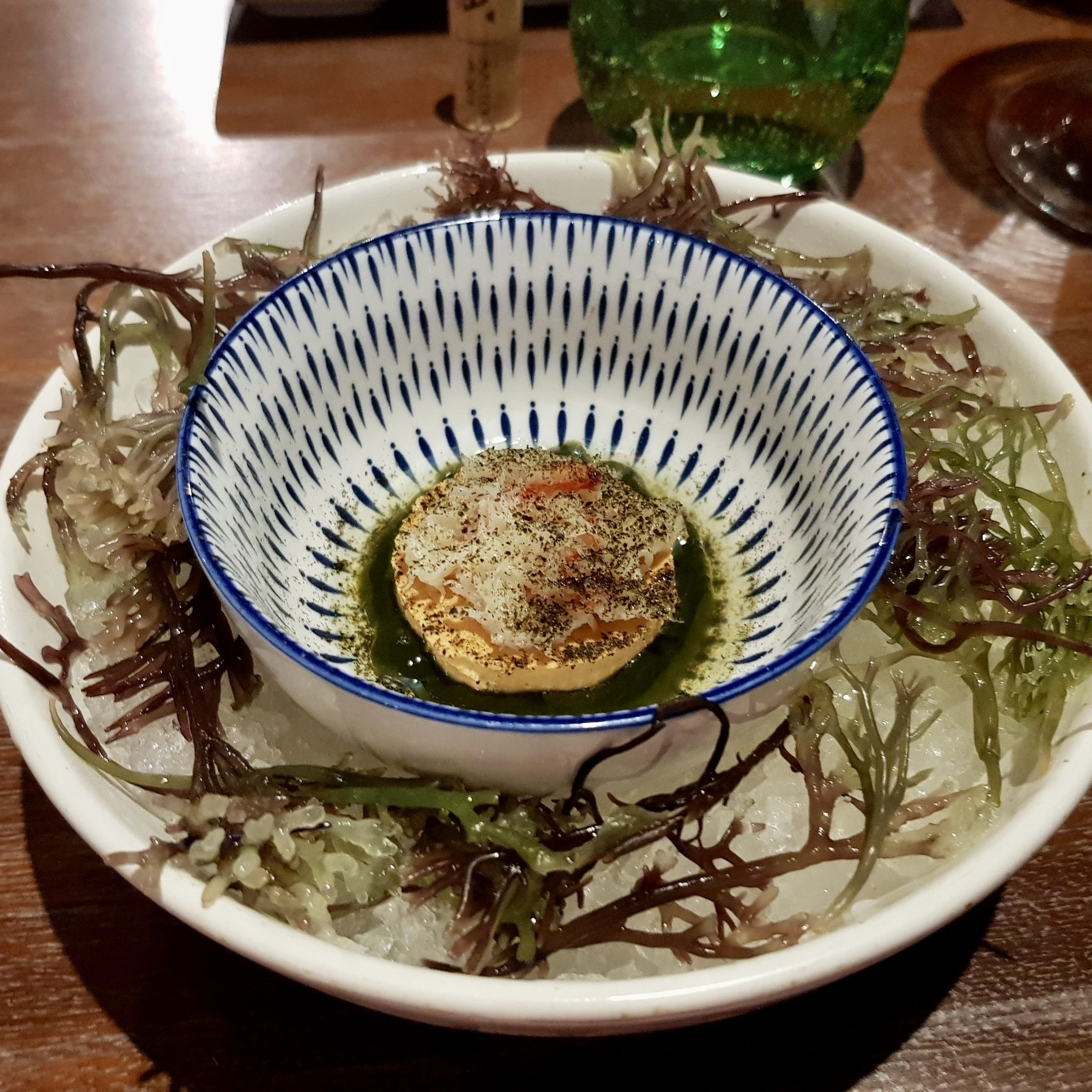 A delicious dish. Cold flesh from sea urchin creamed and topped with sweet snow crab meat. Served on a bed of seaweed sauce. Another unique combination of flavours – the sweetness and richness of the flavours from the sea urchin and snow crab intensified by the salt from the seaweed.