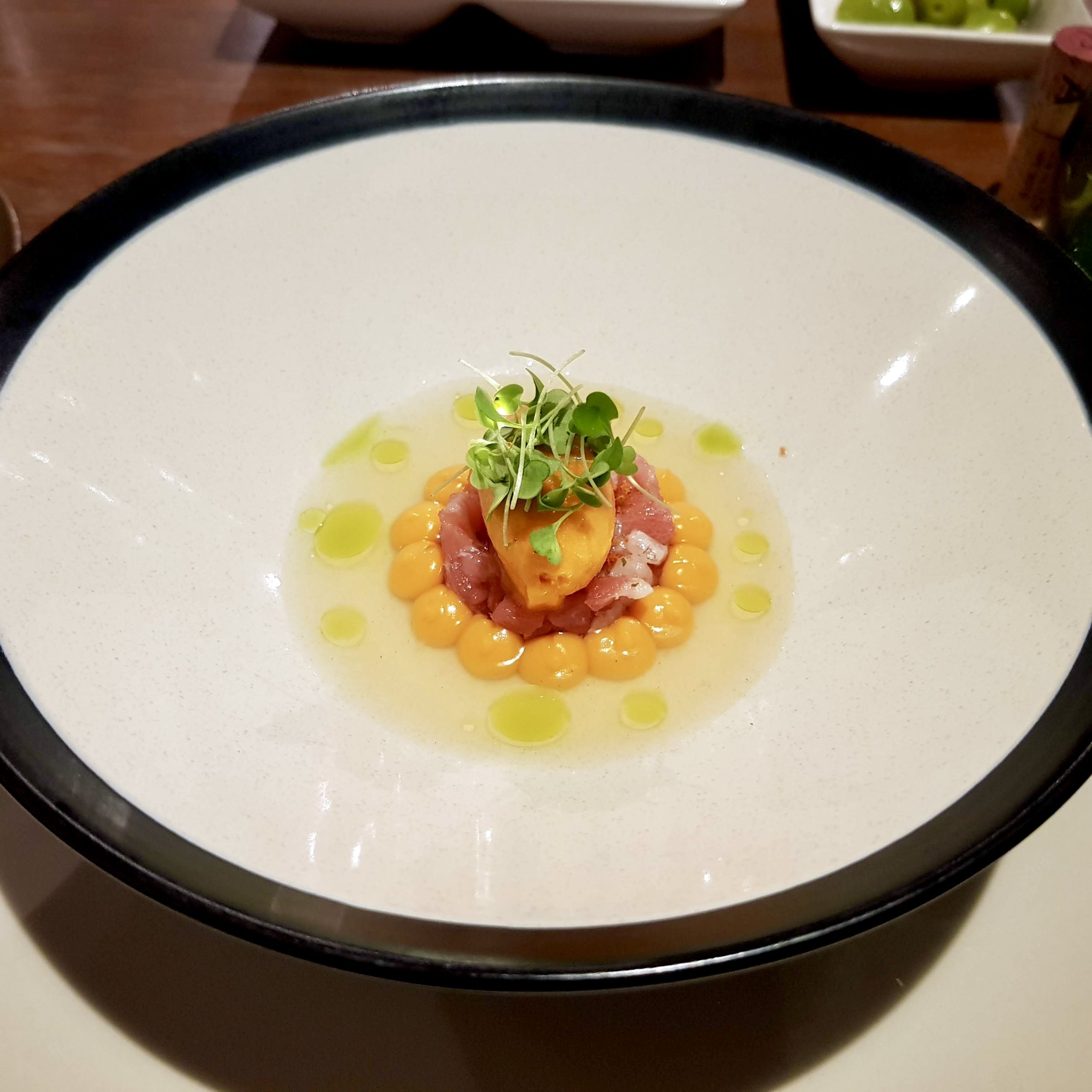 Diced tuna sashimi in a unique pepper sorbet. It is refreshing and rich. Flavours enhanced with the sour broth peppered with olive oil droplets. One of a kind, a good start to the evening. Read about the Almadraba tuna (andalucia.org)