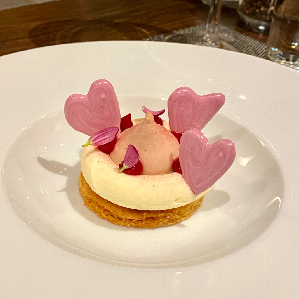 A light and fluffy ring of cream topped with a meringue and droplets of cherry sauce on a crunchy and equally light wafer. The lightness of the textures and the flavours worked beautifully together. Part of Valentine’s 3-course menu CHF79