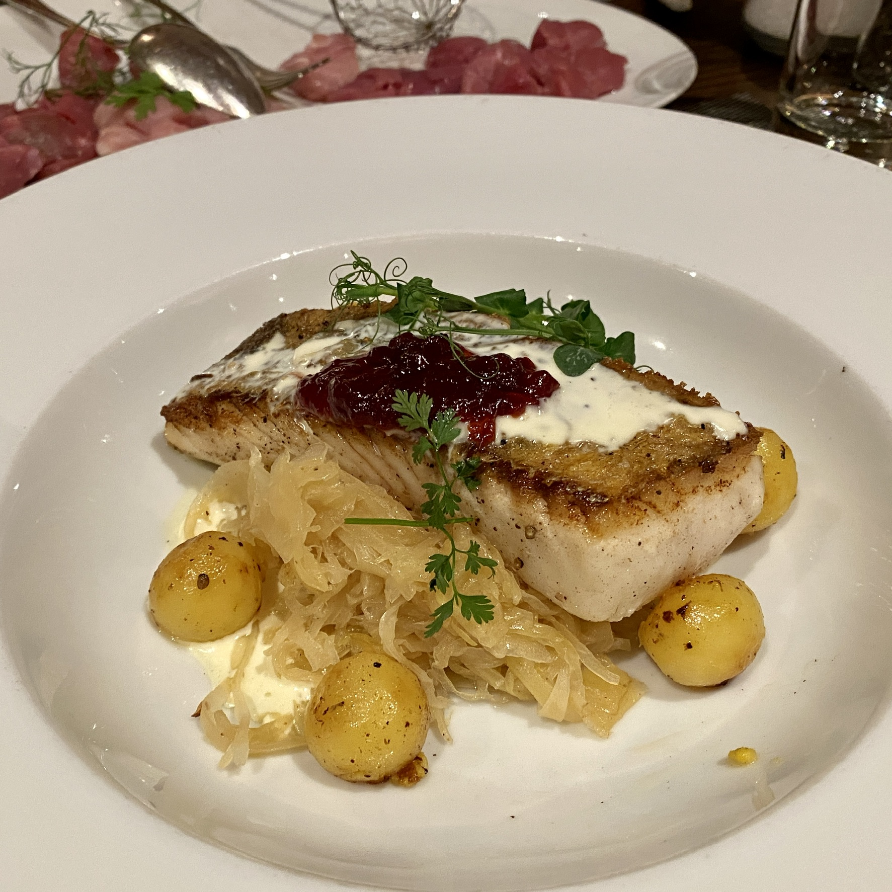 Roasted pike perch accompanied by Parisienne potatoes and sauerkraut refined with mascarpone and cranberries (Recommend)