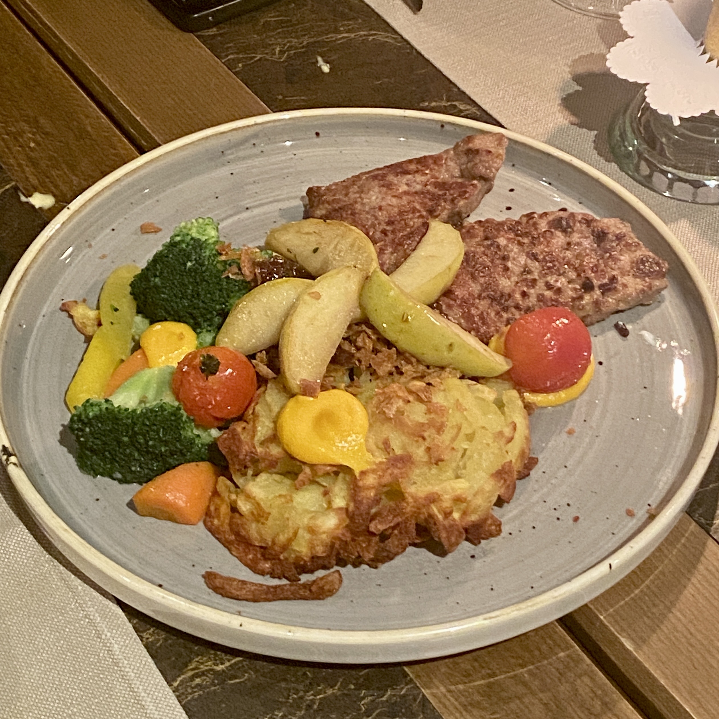 Tender and flavoursome grilled calf liver served with hash brown, pear, broccoli, pepper and roasted cherry tomatoes. The calf liver and hash brown were a touch overdone for our liking. CHF39