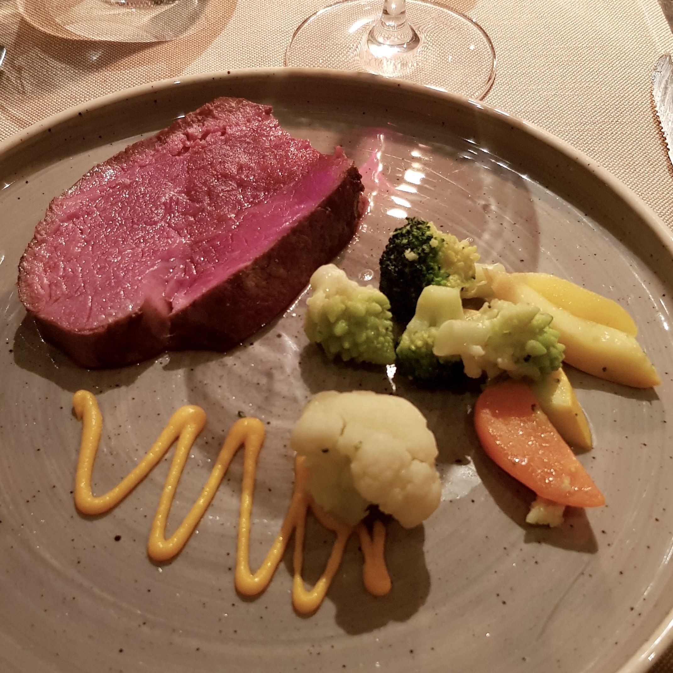 A chunky piece of beef tenderloin to be shared by 2 person. It was served with béarnaise sauce, a selection of vegetables and choice of side dish (potatoes, bacon, roasted onions or pickled vegetables). It was cooked well, pink on the inside to retain its tenderness. Give the portion size, they will serve it over 2 servings, keeping the meat warm while you tuck into them. CHF69.50 per person