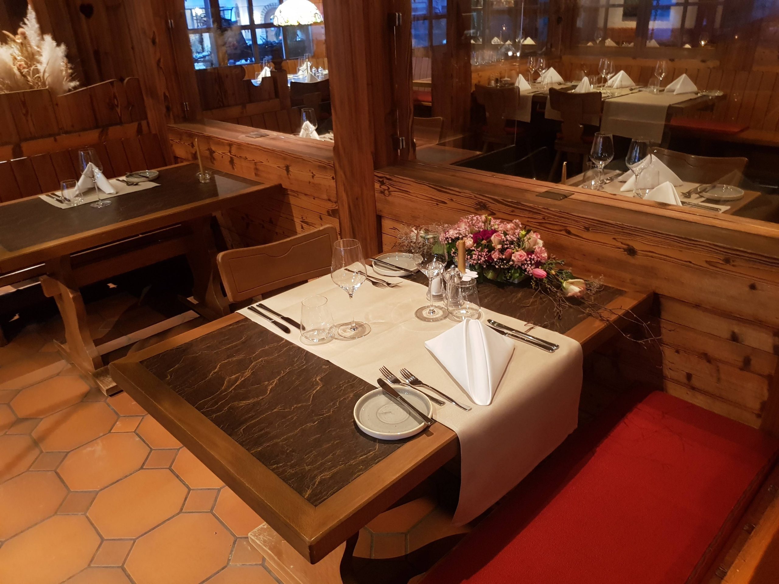 Cosy log cabin. Adlerstube is the showcase à la carte restaurant at the front of the hotel. It is a charming space with traditional Swiss Bavarian ski lodge features. There are majestic wood column, ceiling trusses, Tiffany-styled hanging ceiling lamps and industrial black chains. There is no background music but the place is lively with conversations from diners.