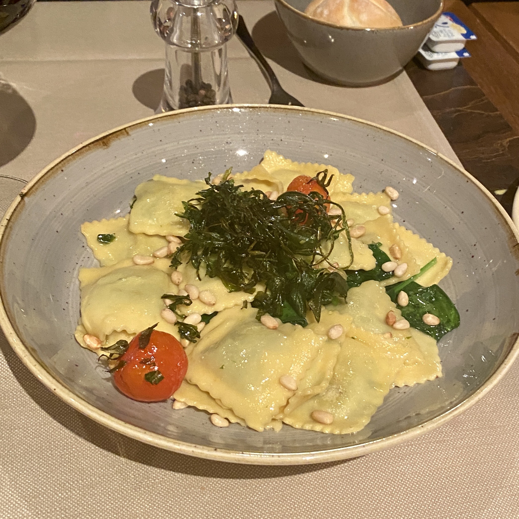 A tasty vegan option of ravioli filled with tofu and spinach served with butter sauce, pine nuts and roasted cherry tomatoes. Simple but flavoursome. CHF26