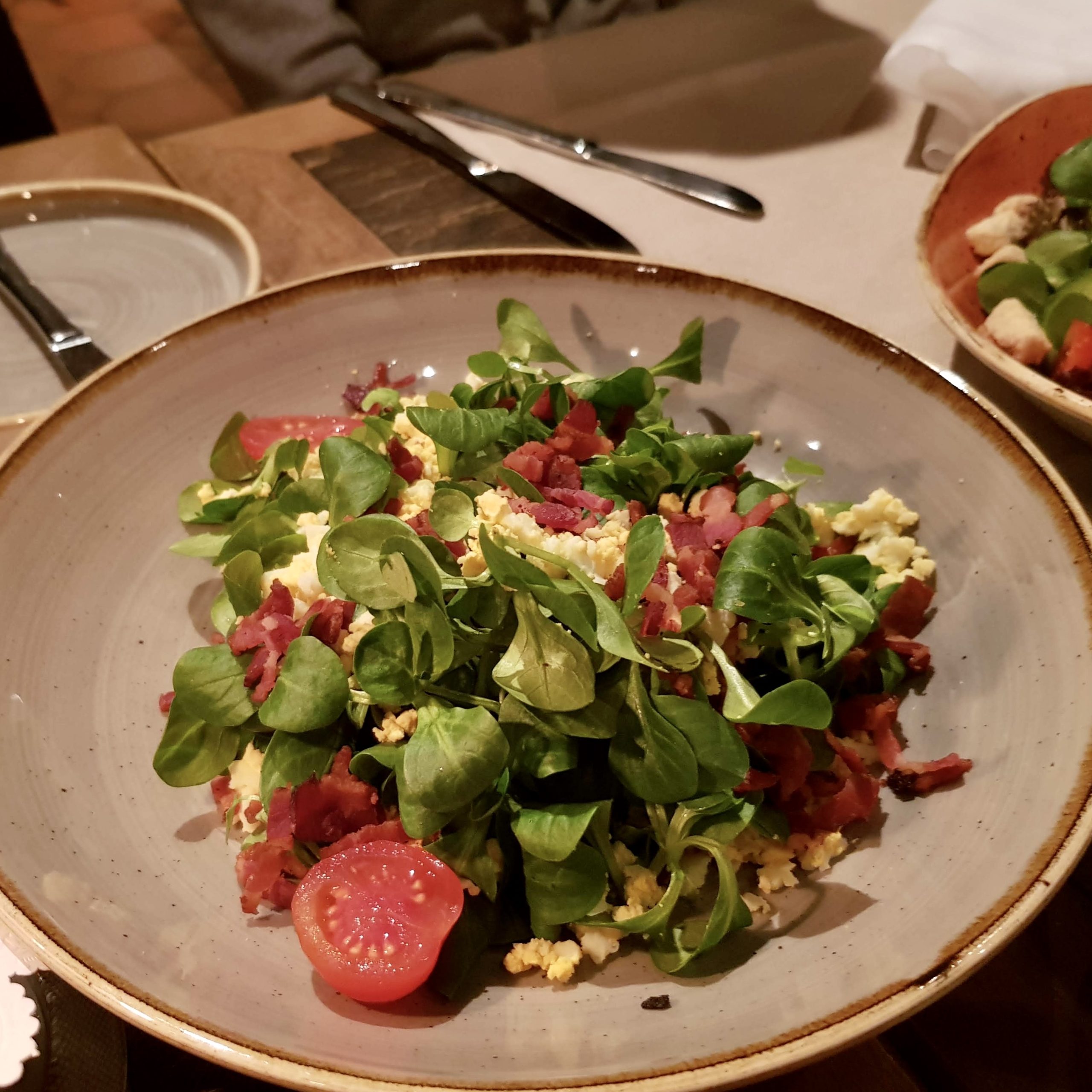 Healthy generous portion of fresh lamb lettuce (mâche) with bacon bits, crumbled boiled egg and a couple of cherry tomatoes. Served with French dressing on the side. CHF14.50