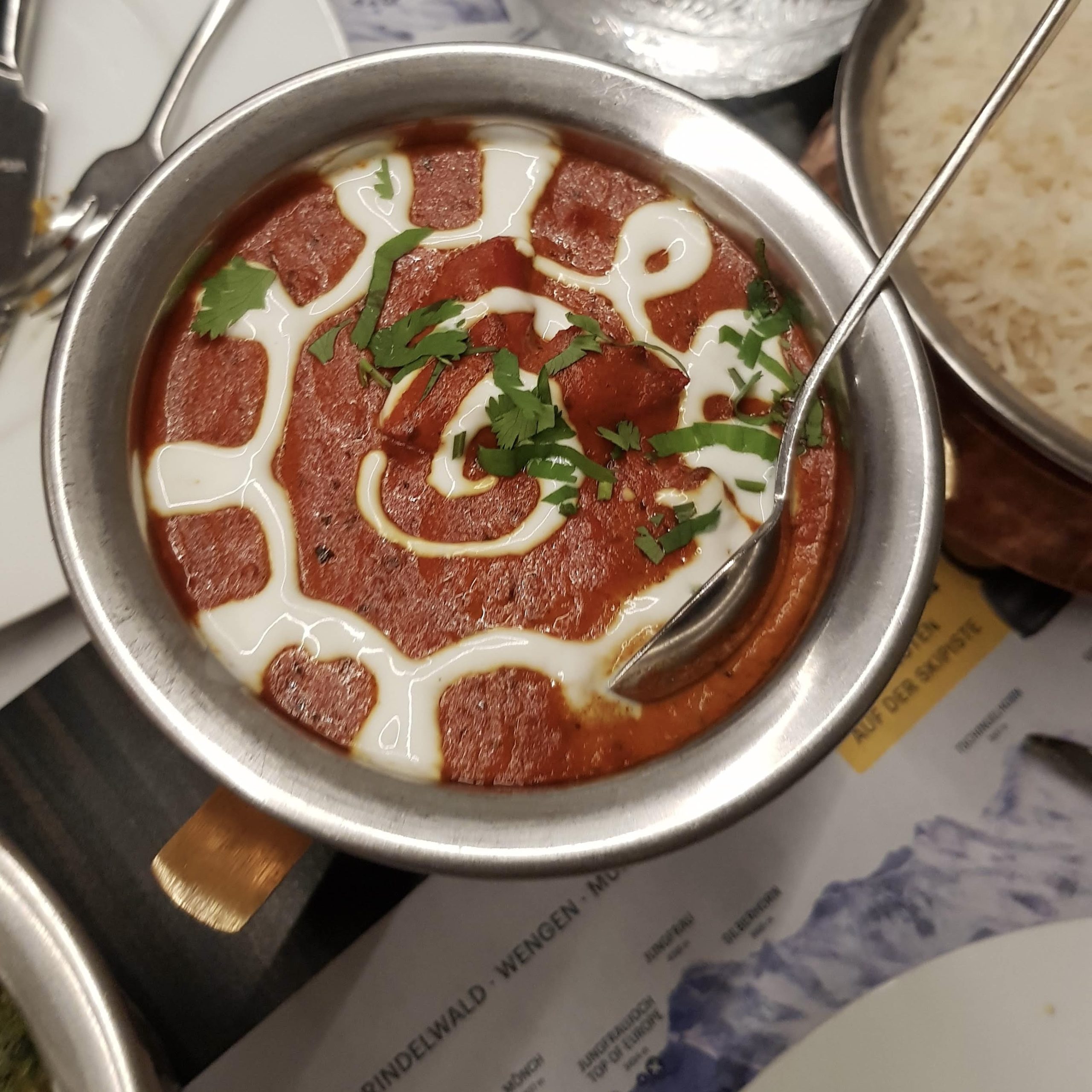 The most popular curry from Kashmir. Rogan josh is made by slow-cooking lamb pieces with yogurt, tomato puree and a long list of spices like chilli, cumin, paprika, turmeric, coriander seeds and so on. Unlike the other dishes, this curry was packing a punch and hitting all the notes. We could even overlook the tough and tasteless lamb pieces in it. CHF32.50