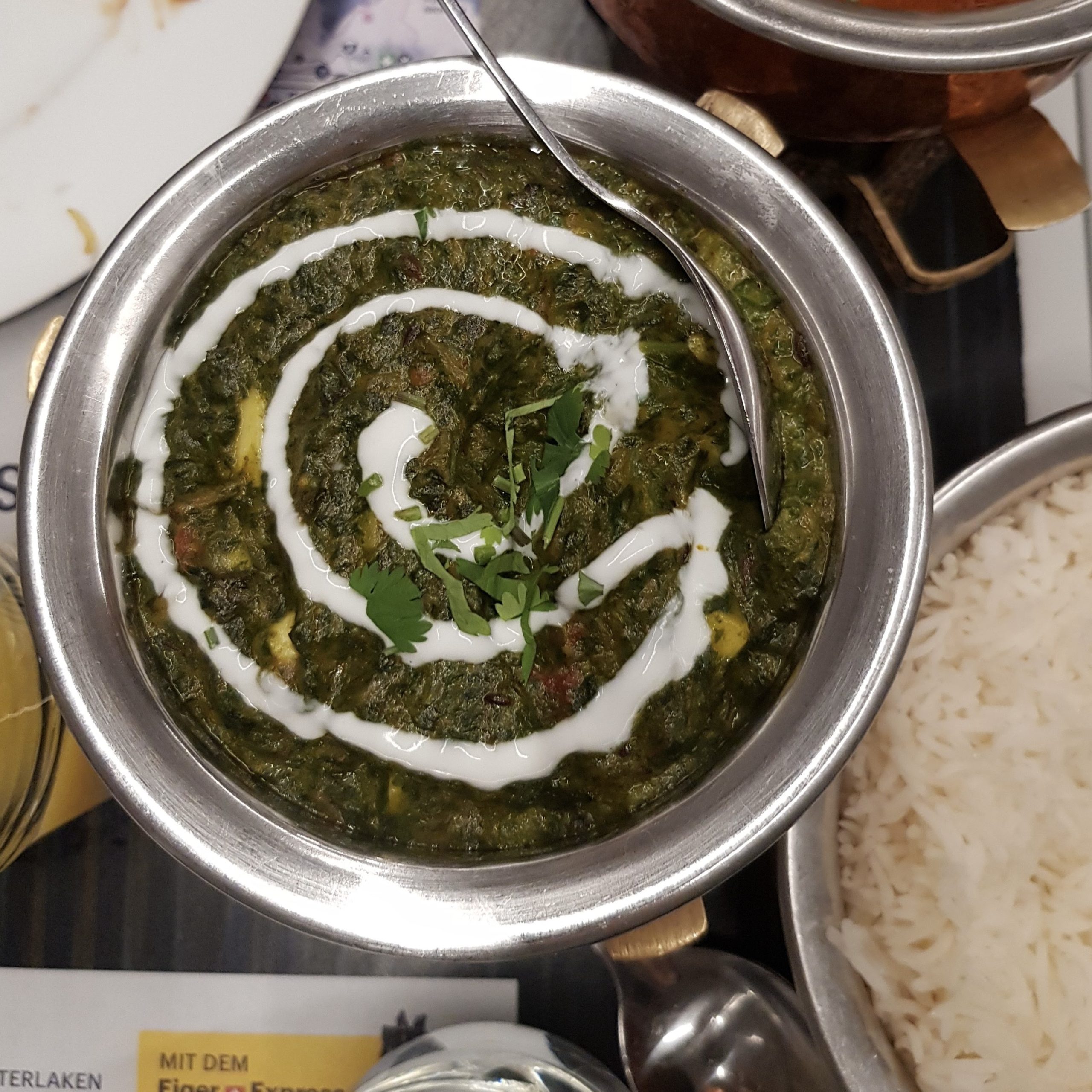 A mildly spicy curry from the Punjab region made with potatoes simmered in mashed spinach. Decent dish, but could do with more flavouring and spices. CHF20.50
