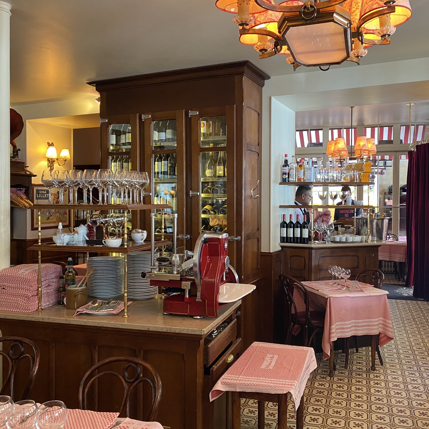 Typical Parisian bistro. Neatly arranged alfresco tables covered with the iconic red and white gingham table cloth lined one side of the restaurant under a similar coloured canopy, with another row of tables across the road next to the fountain. A shame that the outdoor seating area is shaded from the sun by the building across the road.