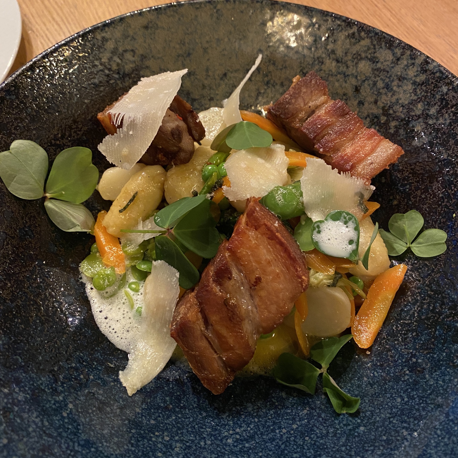 La Poitrine de Cochon et les Gnocchis de Pomme de Terre, Légumes de saison cuisinés au jus (Pork chest and potato gnocchi with cooked vegetables) (Recommend)