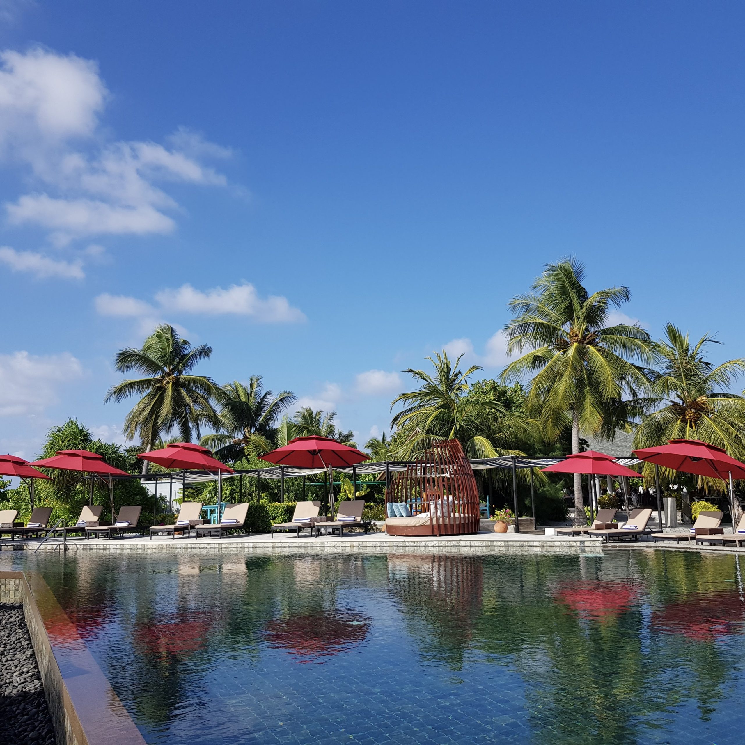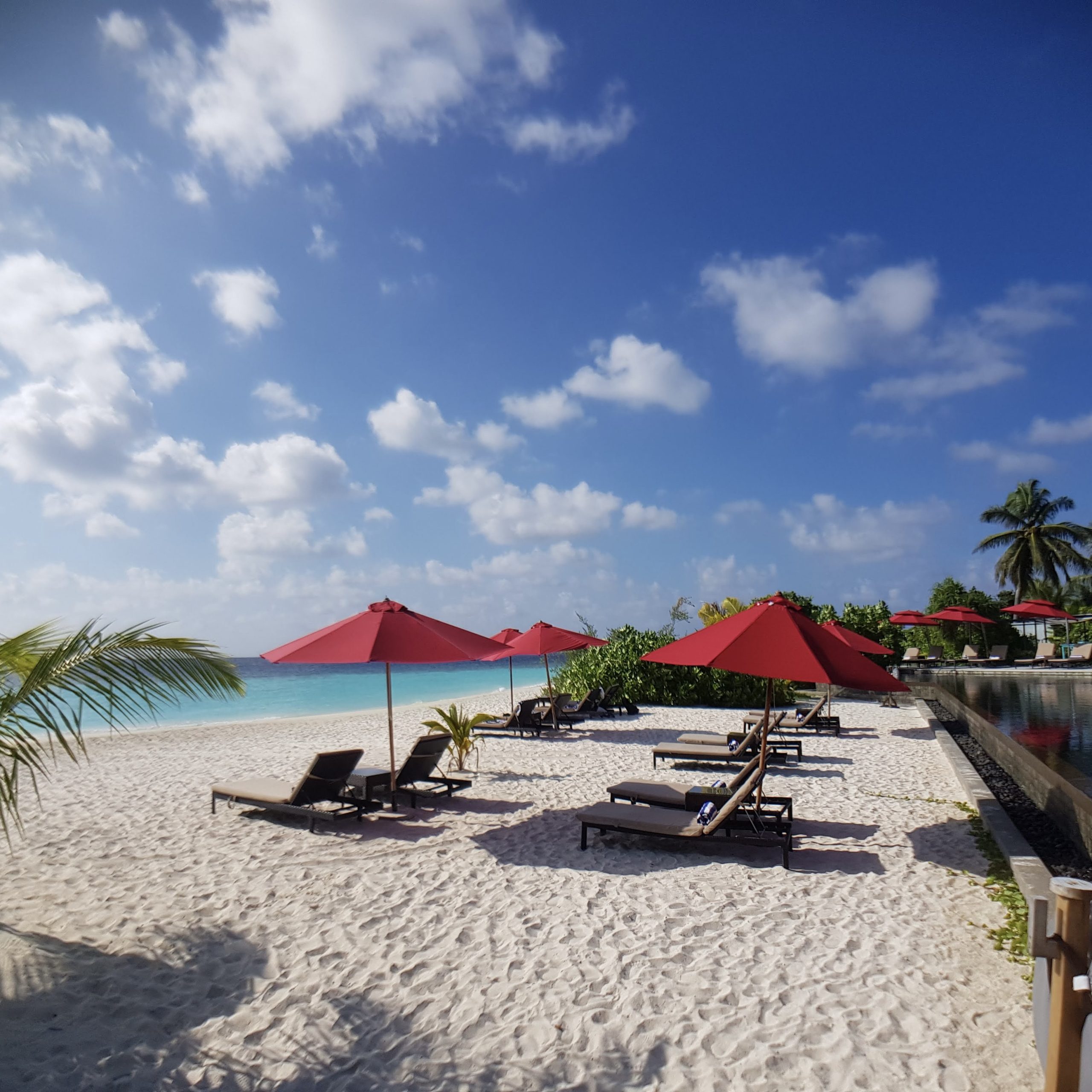 The colour scheme is mostly white which carries through the tranquility from the fine silky sand encompassing the resort. It is interspersed with happy bright red beach umbrellas which contrast beautifully with the lively green from the palm trees to create an elegant fashionable wonderland.