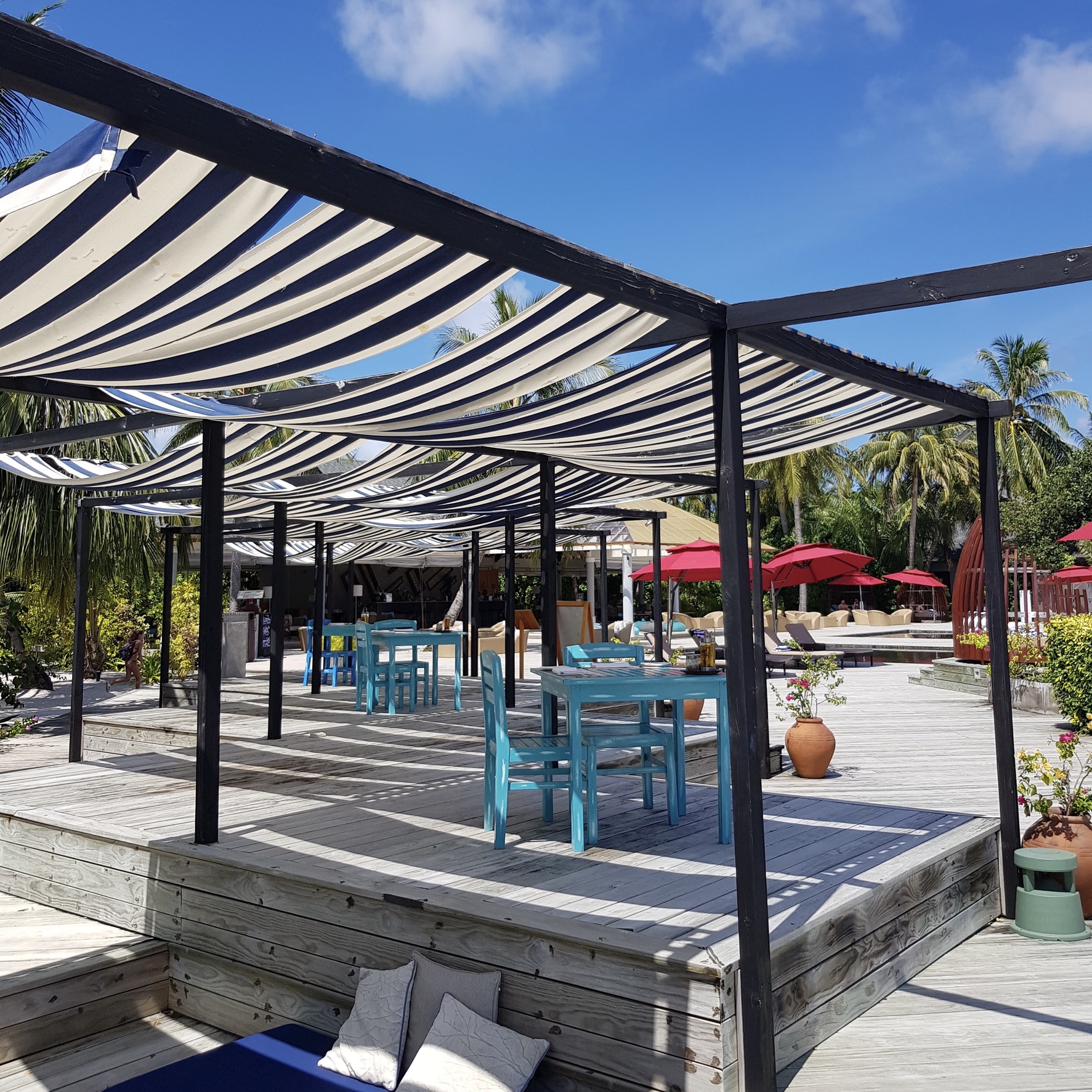 The 3rd option is tucking into a pizza at Pizza Kaage by the swimming pool. The delicious pizzas are made fresh to order under a little hut next to a chef’s herb garden. Enjoy them at the alfresco beach blue wooden table and chairs while being mesmerised by the turquoise Indian Ocean. The pizzas here are part of the all inclusive package (not full-board package) and it is open from 12pm to 6pm.