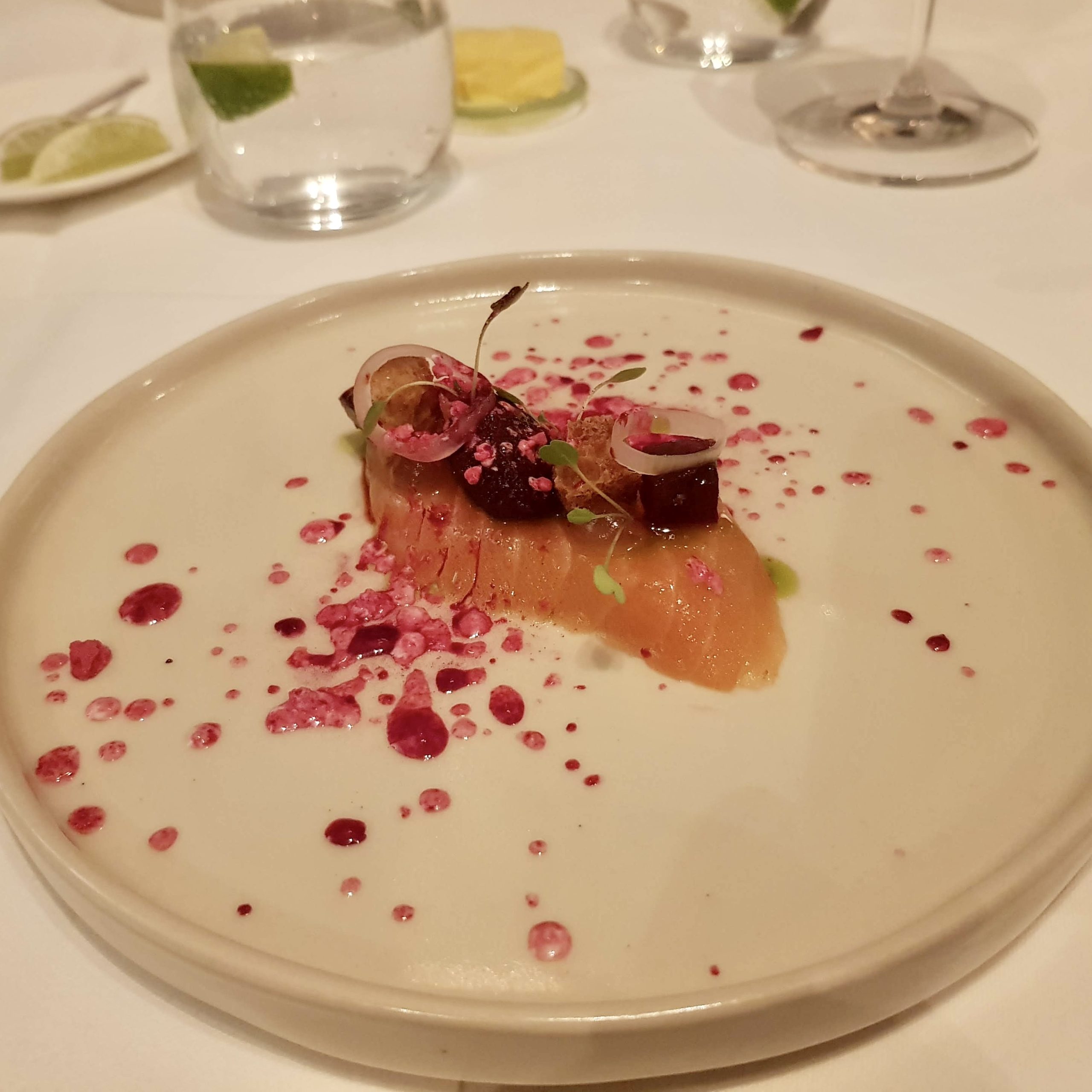 2. Cured Loch Duart salmon, heritage beetroot, pickled onion, horseradish (Strongly recommend)
