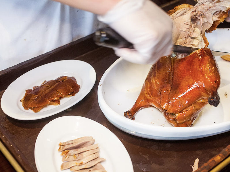 Xindalu – China Kitchen (map) is one of the go-to restaurants in Shanghai for Peking Duck. Located at the Hyatt on the Bund, this contemporary restaurant serves authentic Chinese regional cuisine and the Peking Duck is their signature dish. The entire bird is cooked in a wood-fired oven until the skin achieves its desired crispiness and the meat is cooked through. It’s then carved tableside into three parts (crispy skin, lean meat and dark meat), and served with condiments of sugar and hoisin sauce, thinly sliced scallions and cucumber, and thin pancakes to wrap it all together.